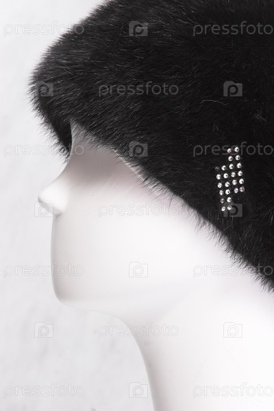 Манекеновая голова с меховой шляпой изолирована на сером фоне