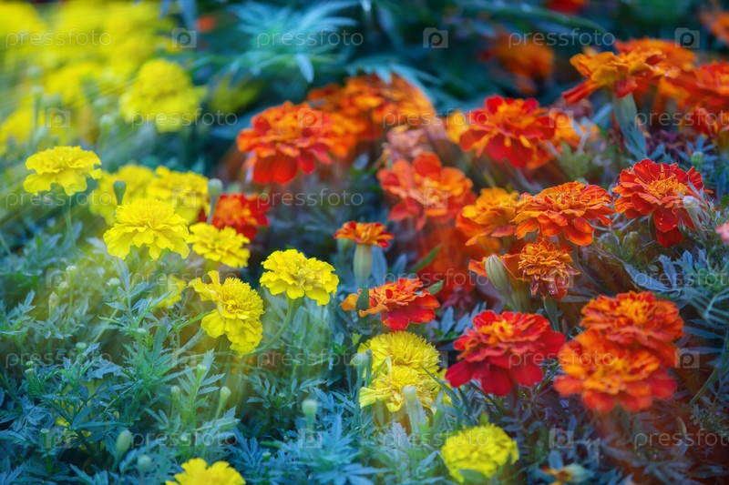 Цветки Мариголда желтые и оранжевые, освещенные желтыми лучами солнца