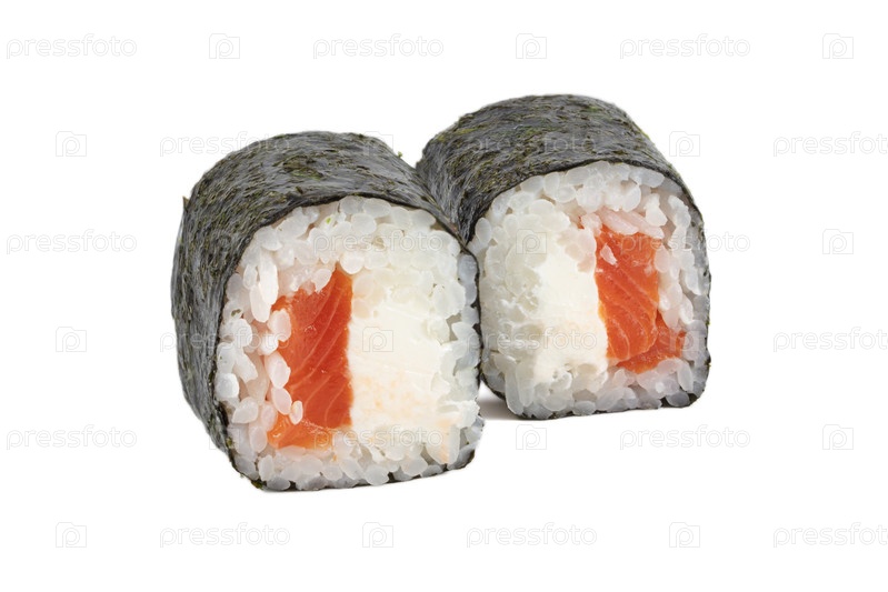 Суши крупным планом изолированы на белом фоне. Суши из морских водорослей нори с рисом из форели и сыром из Филадельфии