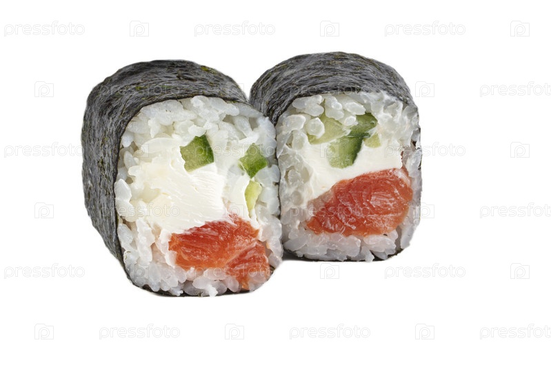 Суши крупным планом изолированы на белом фоне. суши из морских водорослей нори с форелью, огуречным рисом и филадельфийским сыром