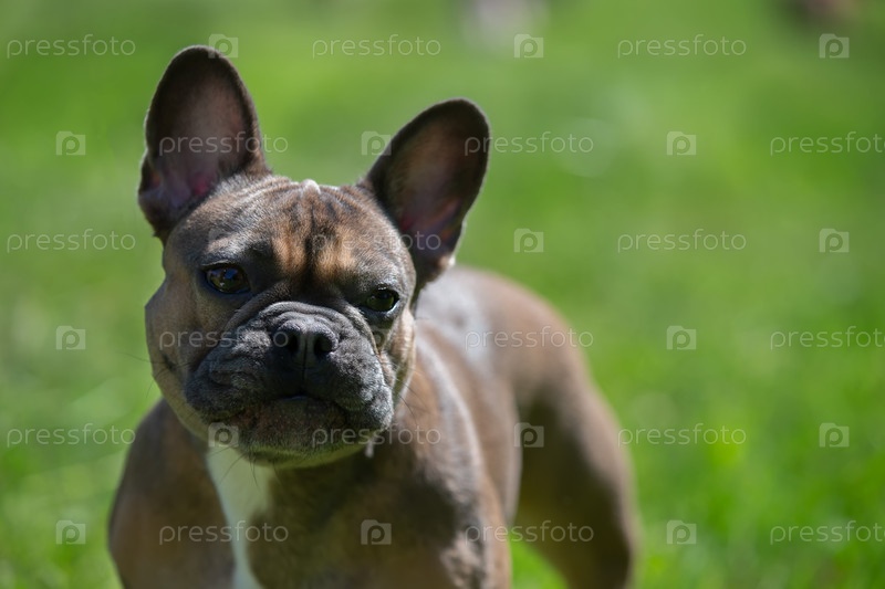 Роскошный французский бульдог благородной крови на зеленом газоне. Милая собака смотрит в камеру