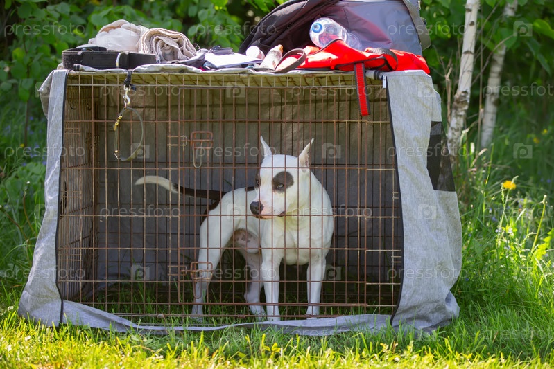 Бойцовская порода питбультерьер в вольере на собачьей выставке