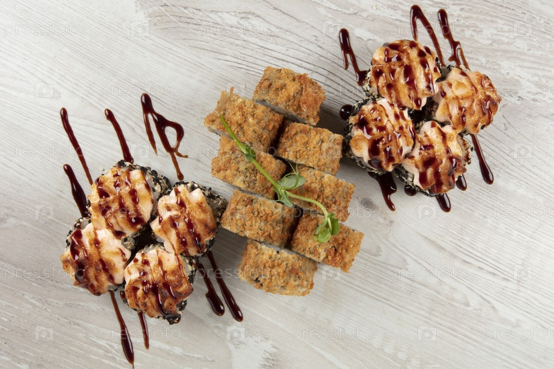 Набор различных суши-роллов на белом деревянном фоне крупным планом