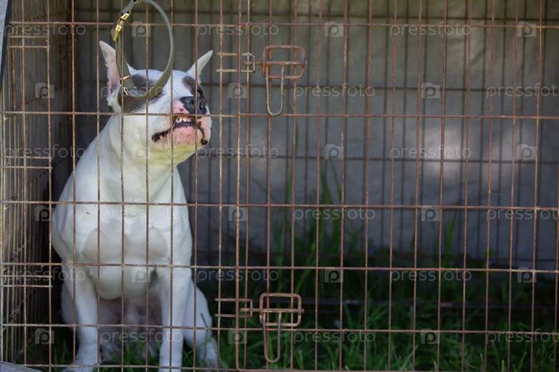 Борющаяся порода питбультерьеров сидит в вольере и жует клетку