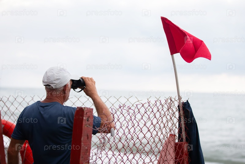 Спасатель смотрит в бинокль на море