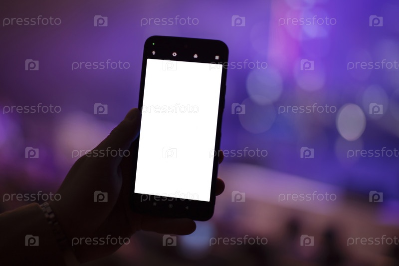 Рука держит смартфон с пустым экраном для копирования текста или информационного контента на темном фоне концерта