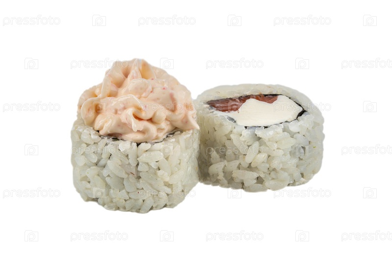 Суши с рисом и тунцом крупным планом на белом фоне