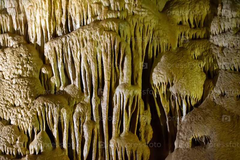 Пещера карстовая, удивительный вид сталактитов и сталагнитов, освещенных ярким светом, красивая природная достопримечательность в туристическом месте