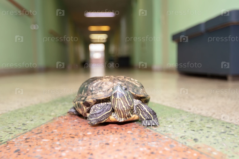 Любопытная старая черепаха идет по коридору и смотрит в камеру