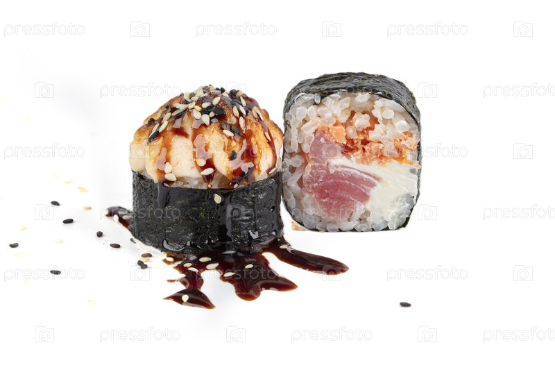 Суши изолированы на белом фоне. Выпеченные суши покрыты соевым соусом и посыпаны семенами кунжута