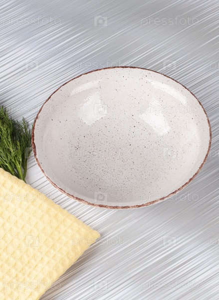 Белая пустая глубокая глиняная пластина с ложкой на сером фоне