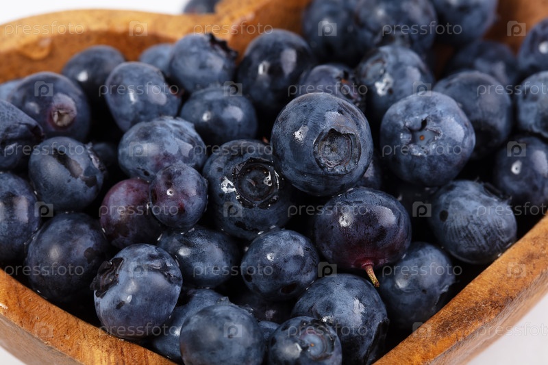 Черника в деревянной тарелке на белом фоне