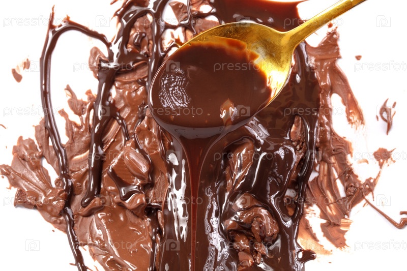 Сладкий расплавленный шоколадный фон с золотой ложкой. Масса шоколада