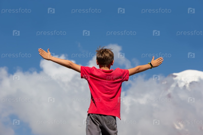 Мальчик-турист стоит на вершине холма, широко раскинув руки по бокам на фоне голубого неба. Концепция путешествия, свобода. Продвигаясь вперед к неизвестному. Свобода выбора