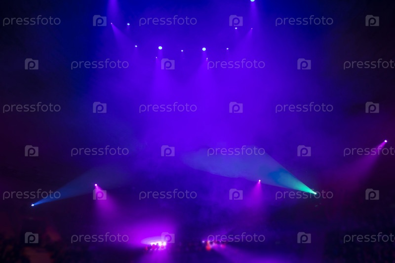 Яркое праздничное многоцветное сценическое освещение с оптическими вспышками и лучами от осветительных ламп