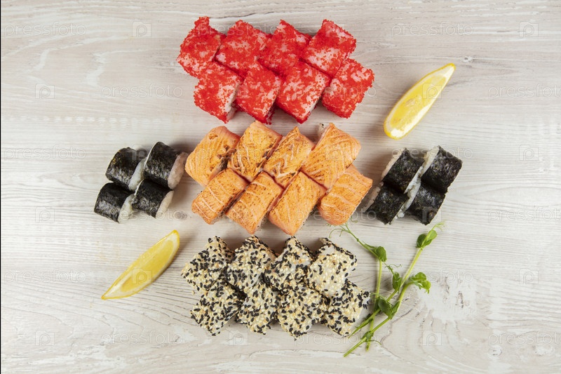 Набор различных суши-роллов на белом деревянном фоне крупным планом