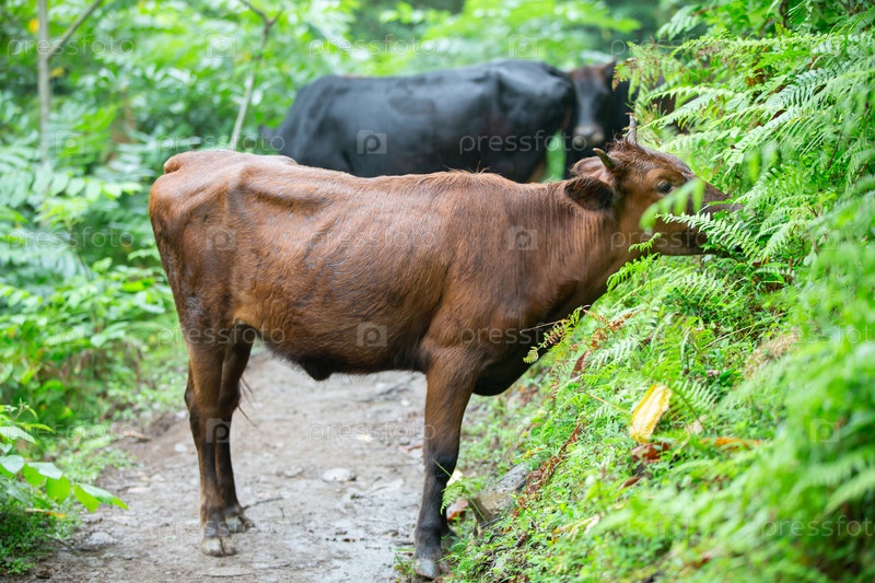 Два быка гуляют и пасутся, едят траву, наслаждаются жизнью