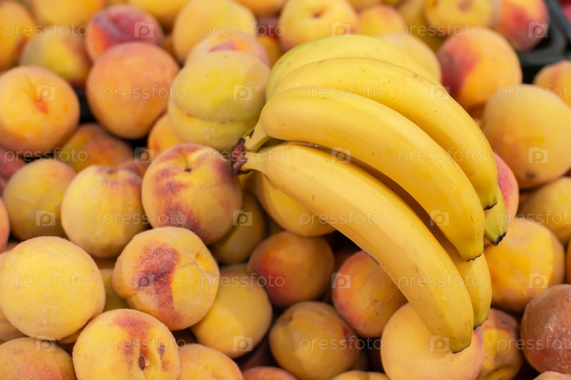 Ветвь желтых спелых бананов и персиков. Тропические фрукты в продаже