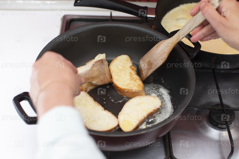 Жареные белые буханки в сковороде. Готовить завтрак