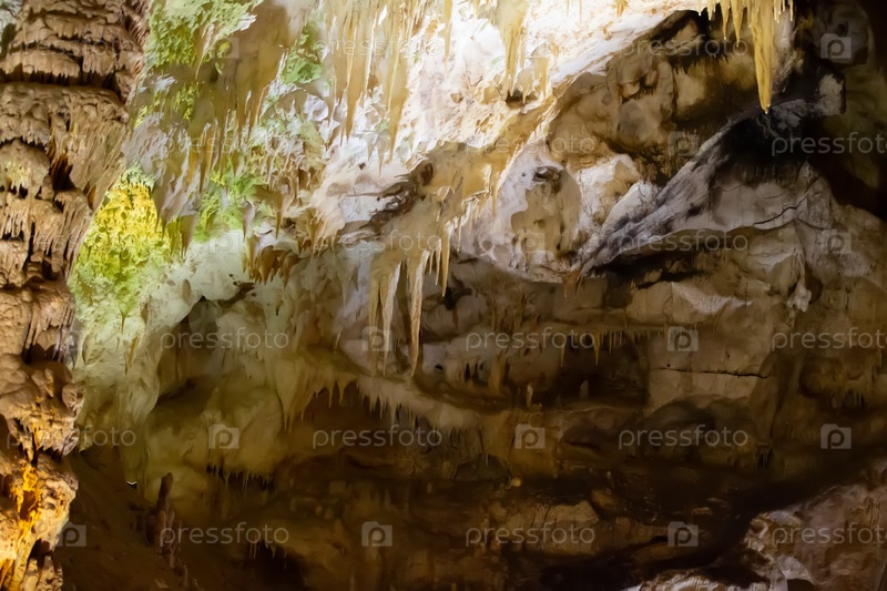 Пещера карстовая, удивительный вид сталактитов и сталагнитов, освещенных ярким светом, красивая природная достопримечательность в туристическом месте