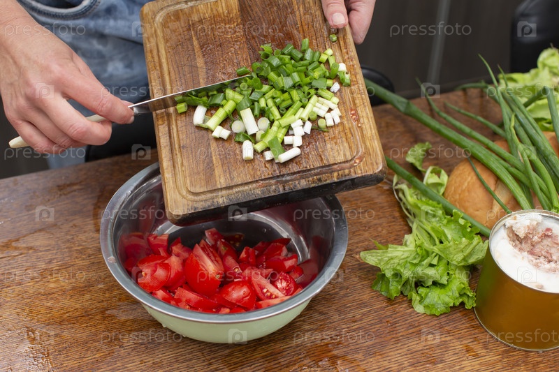 Вырезать зеленый лук и помидоры и поместить их в миску. Приготовьте салат