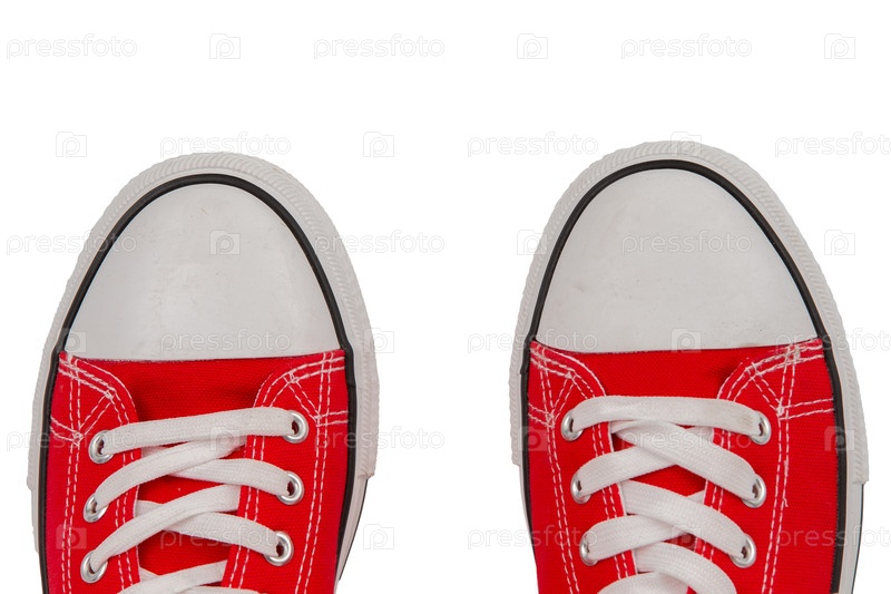 Красные кроссовки крупным планом на белом фоне, вид сверху