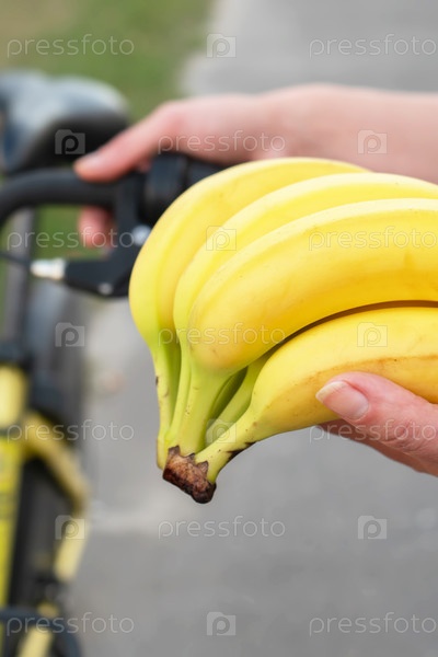 В руке вертикально держится стопка бананов