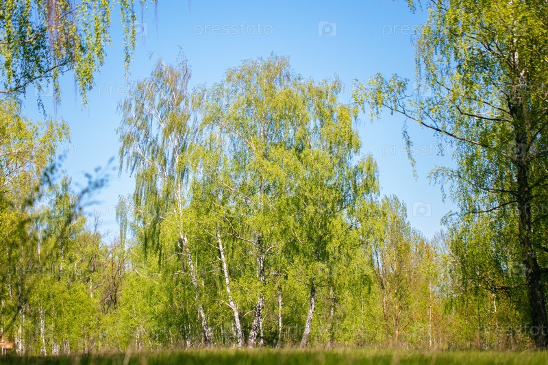 Летний березовый лес на фоне голубого неба