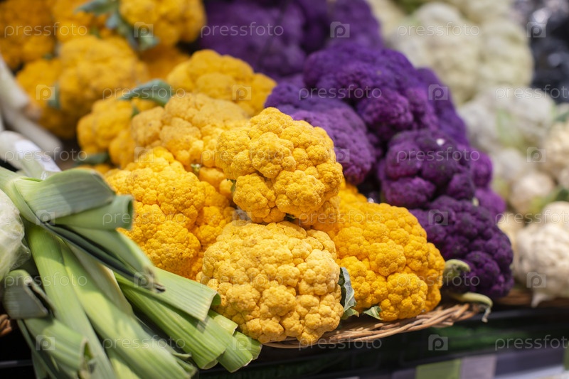 Многоцветная цветная капуста на полке супермаркета