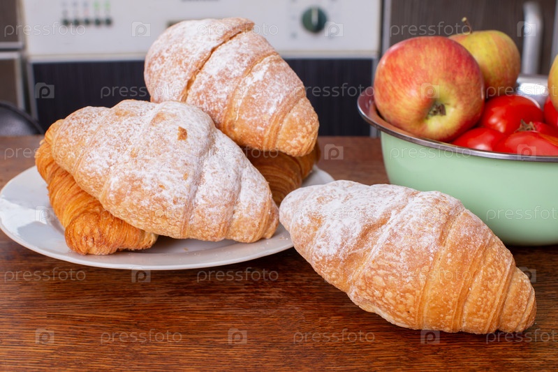 Круассаны на кухонный столе посыпаны сахарной пудрой