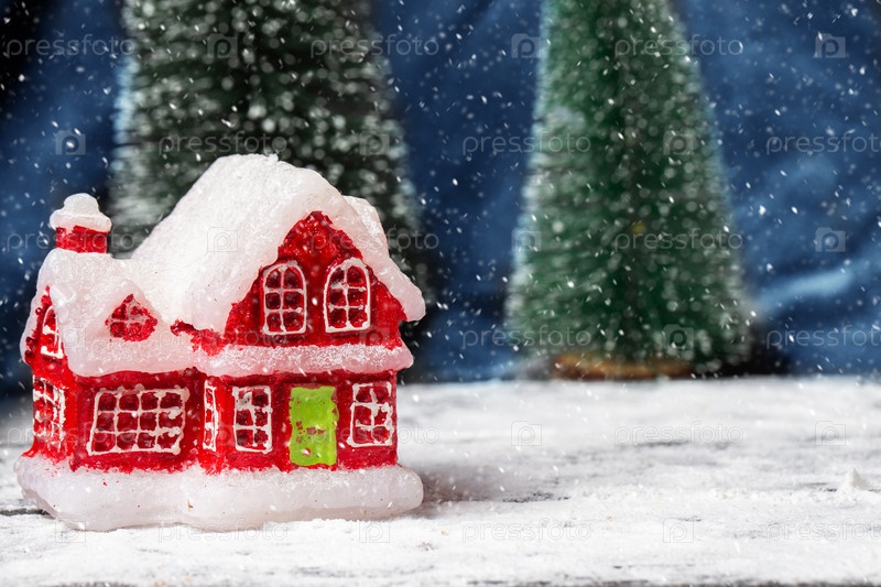 Красный Рождественский игрушечный домик на фоне ели и летающих снежинок. Рождественская детская открытка