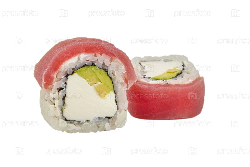 Суши катится на белом фоне. Японская еда из риса, водорослей, нори, форели и филадельфийского сыра