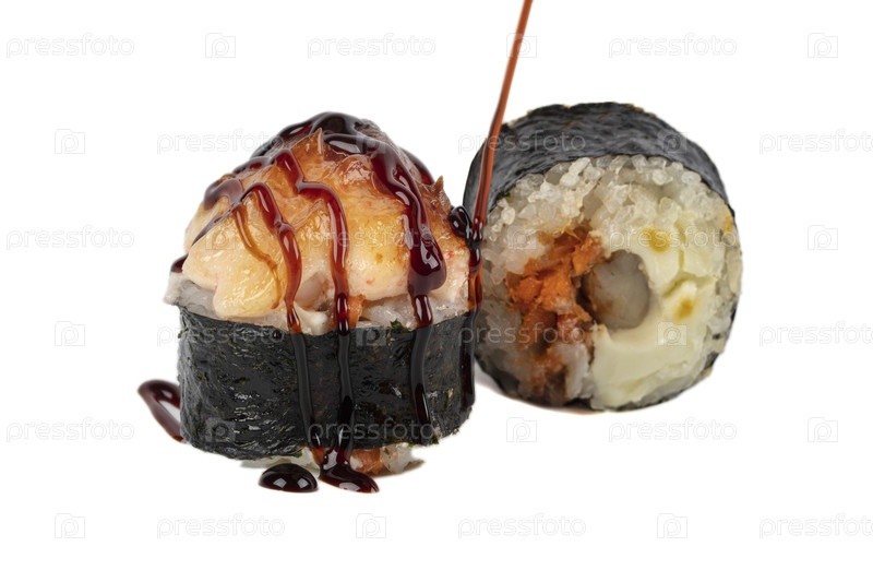 Суши изолированы на белом фоне. Запеченные суши с соевым соусом