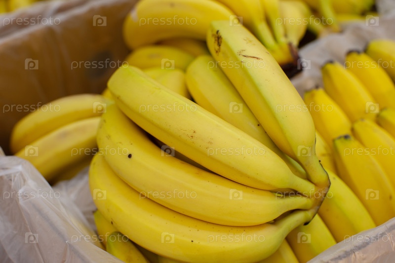 Много банановых веток в картонной коробке для продажи