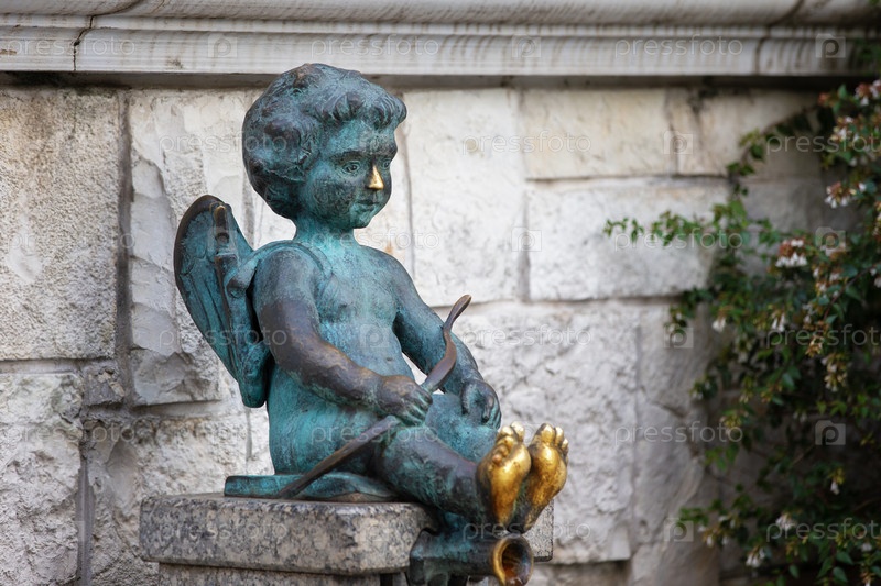 7 августа 2022 г. Грузия, Батуми. Купидон на площади Пьяцца в старом городе Батуми. Статуя маленького ангела с золотыми ногами, которые люди втирают для удачи