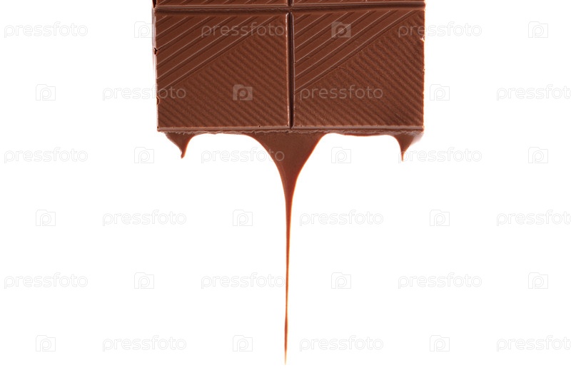 Кусочек расплавленного шоколадного батончика изолирован на белом фоне. Шоколад капает