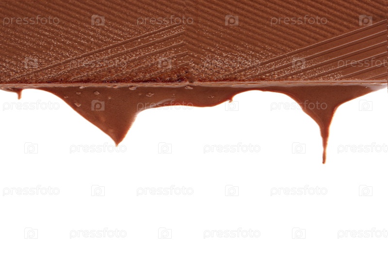 Кусочек расплавленного шоколадного батончика изолирован на белом фоне. Шоколад капает