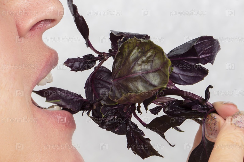 Женщина, лицо которой не видно, держит во рту ветку базилика. Ешьте зелень