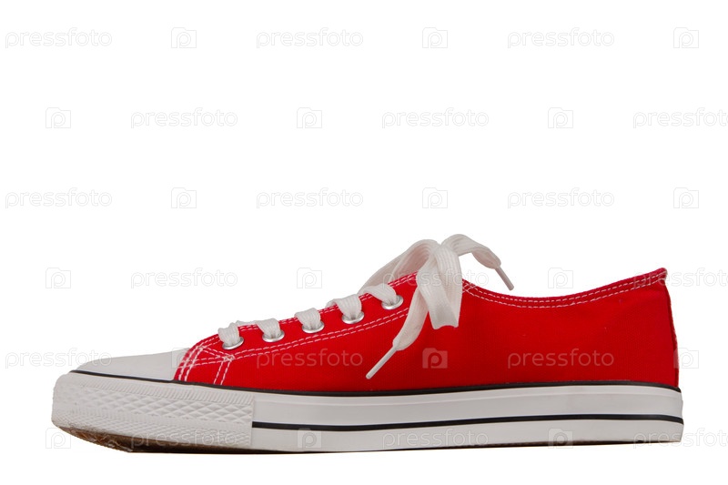 Один красный кроссовок крупным планом на белом фоне, вид сверху. Модная обувь