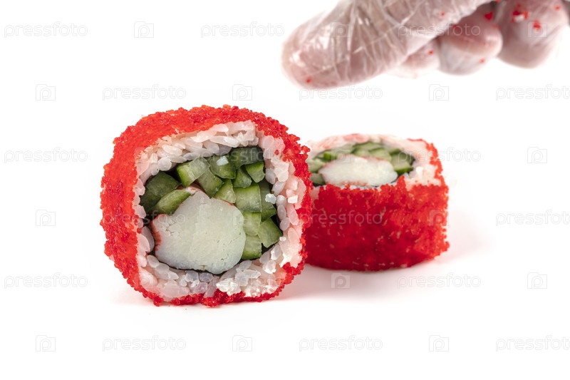 Суши-роллы кости в красной искусственной икре на белом фоне крупным планом с рукой в кулинарных перчатках