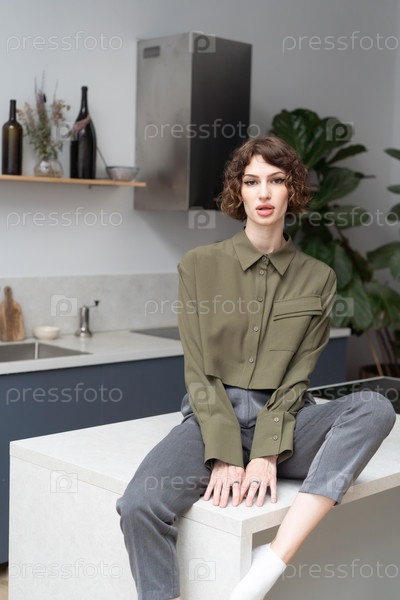 Молодая красивая женщина позирует в зеленой рубашке в студии