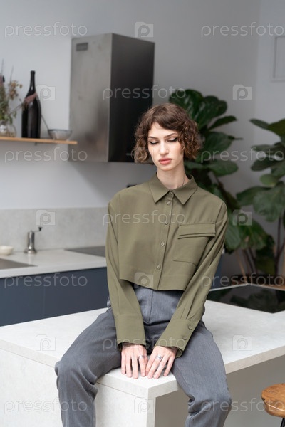 Молодая красивая женщина позирует в зеленой рубашке в студии