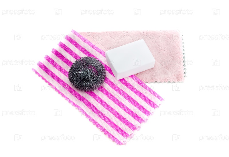 Чистка тряпок и мочалок на белом фоне