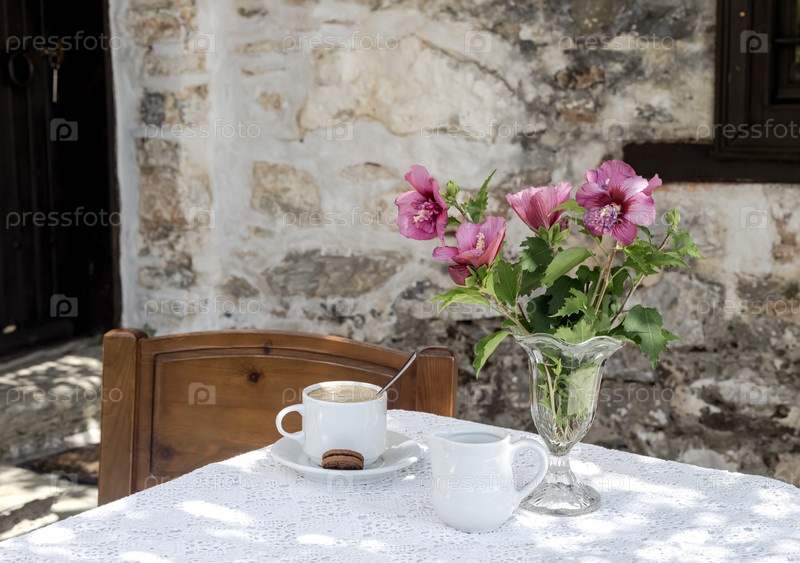 Натюрморт с гибискусом и чашкой кофе на столе крупным планом