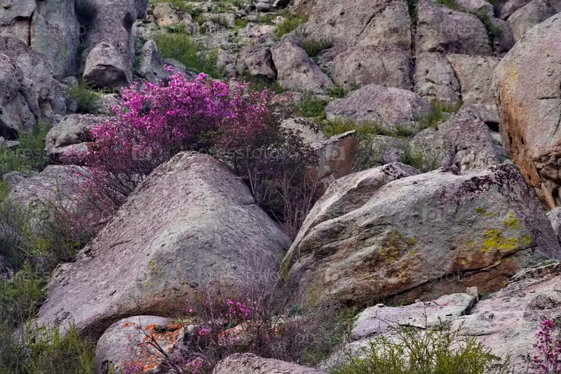 Россия. Горный Алтай. Цветущий кусты рододендрона Ледебура (маральник) на склонах гор вдоль Чуйского тракта недалеко от села Купчегень