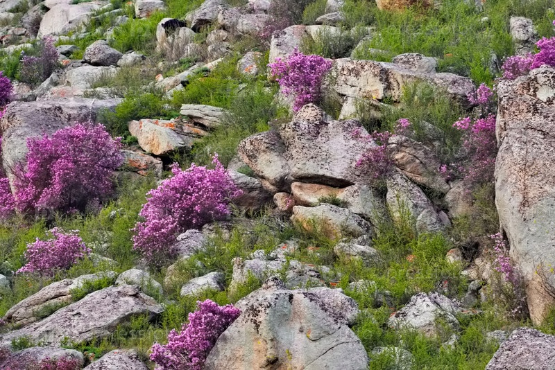 Россия. Горный Алтай. Цветущий кусты рододендрона Ледебура (маральник) на склонах гор вдоль Чуйского тракта недалеко от села Купчегень