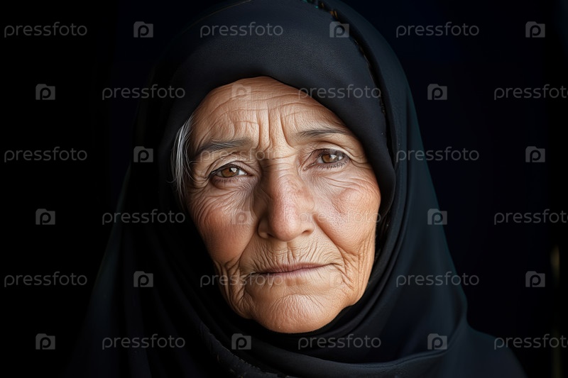 Портрет пожилой женщины в черном платке смотрит в камеру