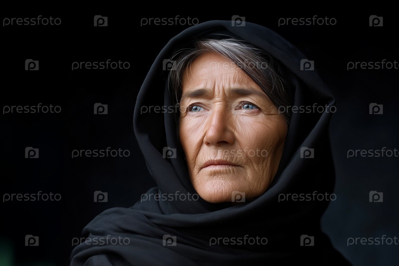 Портрет старухи в черном платке с серьезным выражением лица
