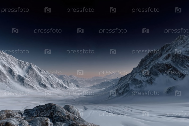 Инопланетная фантазия замерзла далеко от звезды. Горы и снег