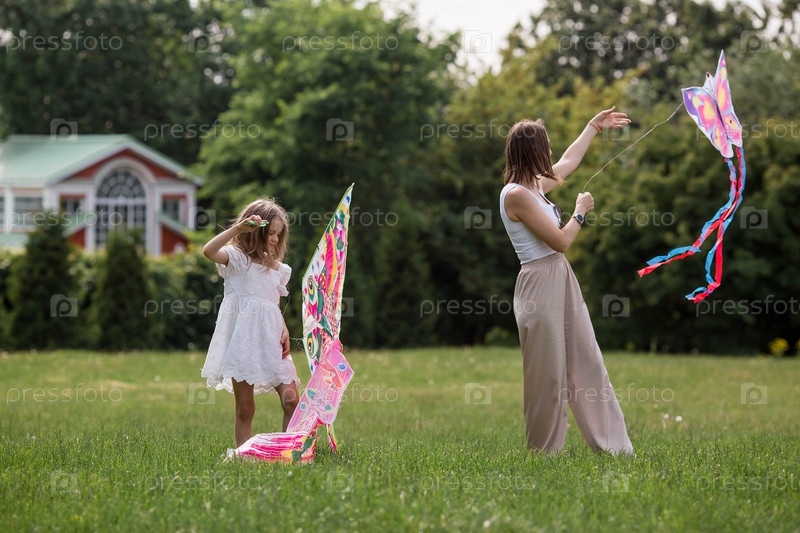 Дети в летнем парке. Красивая девушка и ее мать летают на воздушном змее. Теплые семейные моменты или концептуальный образ для проведения времени на открытом воздухе
